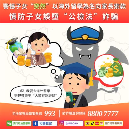 【本報訊】近日,司警局接獲數名家長檢舉,報稱早前正在海外升學的子女,因即將前往其他國家留學,辦理簽證需“大額存款證明”為由,向家長索取巨款。家長未經深入了解,貿然向子女匯出款項,而子女收取款項後,隨即匯予騙徒。惟事後家長才發覺子女誤墮“公檢法”電話詐騙,招致巨額財產損失。