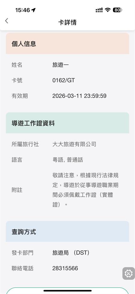 【本報訊】旅遊局今(12月10日)起在“一戶通”專業類電子卡包新增導遊工作證電子卡證,進一步便利業界,實現導遊工作證申請及辦理相關服務全電子化,配合推動電子政務發展。