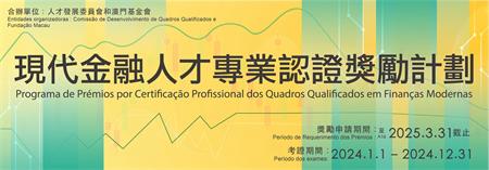 “現代金融人才專業認證獎勵計劃”的申請條件為:於2024年1月1日至12月31日期間,取得獎勵目錄內證照的澳門居民,可於網上申請,獎勵分1,000、3,000、6,000及8,000澳門元四個組別,分別有30、120、80和80個名額,合共310個。同一獎勵項目只能獲獎一次,此規定亦適用於本計劃過往的獲獎者。計劃旨在推動澳門居民考取與證券、資產管理、財富管理、風險管理及金融分析相關專業認證,藉此為業界儲備各類具專業認證資格的金融人才。