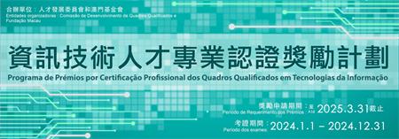 “資訊技術人才專業認證獎勵計劃”的申請條件為:於2024年1月1日至12月31日期間,取得獎勵目錄內證照的澳門居民,可於網上申請,獎勵分3,000及4,000澳門元兩個組別,每個組別相應有120個和170個名額,合共290個。同一認證考試只可獲獎一次;獎勵目錄內同一項考試,倘申請人曾獲獎,則是次考試必須考取高於上一次的獲獎級別方可再次獲獎。計劃旨在推動澳門居民參加與網絡安全、信息與通訊技術等相關專業認證考試並取得認證資格,為業界培養和儲備具網絡安全、系統審計以及信息與通訊技術數據安全等專業認證資格的人才。