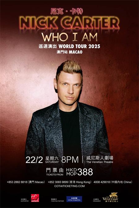 【本報訊】國際流行巨星尼克卡特 (Nick Carter) 將於2025222日在威尼斯人劇場舉行尼克卡特2025<WHO I AM>巡迴演出澳門站。門票將於20241213日中午12時起公開發售,只限網上及電話訂票。