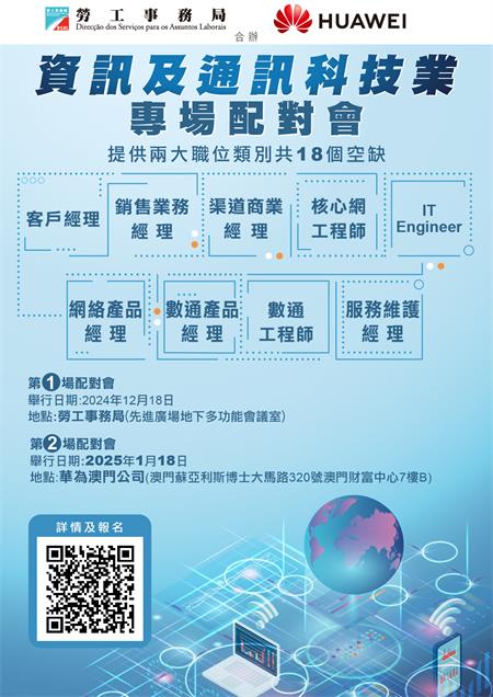 【本報訊】為積極配合特區政府推動“1+4”經濟適度多元發展策略,提供高新科技產業的就業機會,勞工事務局與華為服務(香港)有限公司-澳門分公司(下稱“華為澳門”)合辦兩場資訊及通訊科技業專場配對會,提供兩大職位類別,分別為客戶及產品銷售類的經理、數字通訊及網絡技術類的工程師,合共18個空缺。第一場配對會報名期由12月12日至12月17日中午12時,第二場配對會報名期由12月19日起至1月10日。