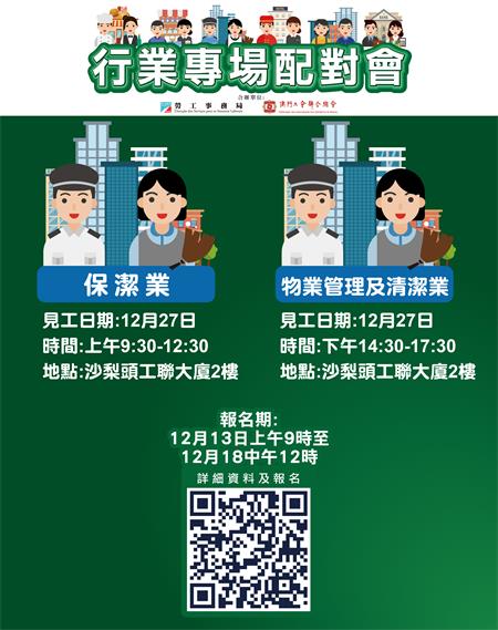 12月27上午保潔業配對會和下午物管及清潔業配對會均在澳門工會聯合總會二樓(沙梨頭海邊街2-6號工聯大廈)舉行。報名日期為12月13日上午9時至12月18日中午12時。