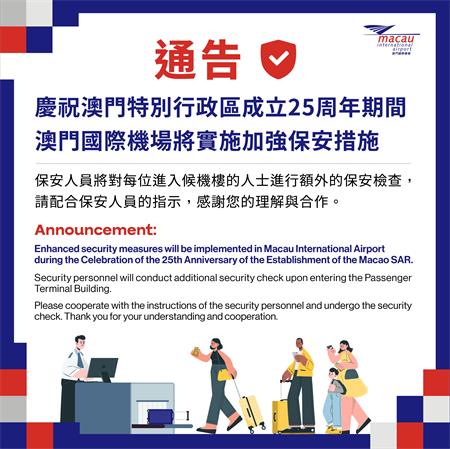 【本報訊】為保障澳門特別行政區成立25周年慶祝活動的安全進行,澳門國際機場將於2024121620日期間實施加強保安措施。保安人員將對每位進入候機樓人士進行額外的保安檢查,請配合保安人員的指示,感謝您的理解與合作。