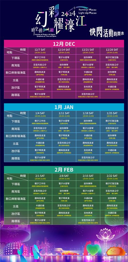 2024幻彩耀濠江”活動期間逢周六晚上8時至9時,在6區的特定地點將有不同的快閃活動,增加現場歡樂氣氛。明天(1214)的快閃活動包括:下環區阿婆井前地電子大提琴、南灣區南灣‧雅文湖畔迷你樂隊、新口岸新填海區何賢公園電子琴表演、北區東方海岸休憩區巨型充氣公仔、氹仔區嘉妹前地(北帝廟前面) – 趣味扭波波。更多快閃活動詳情可瀏覽“2024幻彩耀濠江”網站(https://lum.macaotourism.gov.mo)。