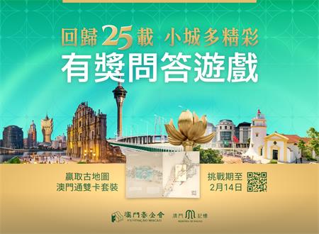 【本報訊】澳門回歸祖國25年來,在中央的大力支持下,特區政府團結帶領社會各界協同奮進,推動經濟適度多元發展,擴大對外交流合作,邁進新時代發展的征途,譜寫了具有澳門特色“一國兩制”成功實踐的華彩篇章。為慶祝澳門特別行政區成立25周年,由澳門基金會開展的“澳門記憶”文史網,特推出“回歸二十五載 小城多精彩”網上有獎問答遊戲。