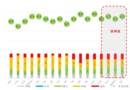 【本報訊】澳門經濟學會近日發佈的《澳門經濟景氣指數研究》2024年12月澳門經濟景氣指數走勢及預測,預測指,今年十月與十一月期間,本澳經濟景氣指數體系中的十三項指標依然呈現“兩極化”分佈。其中,十月本澳貨幣供應M2同比增長7.5%至7,828億澳門元的歷史新高,顯示金融體系流動性充裕。與此同時,在旅遊相關行業的強勁復甦帶動下,就業市場偏熱,總就業人數持續增加,且失業率也持續多月維持在1.7%的低位。總體而言,M2、訪澳旅客數目、就業人數等七項指標處於“偏熱”或“過熱”狀態;受旅客結構及消費模式的轉變化及本地消費外流的影響,本地零售及飲食消費的需求勉強保持在“穩定”等級;內地消費者信心指數和六大綜合旅遊休閒企業的股價仍“低迷”。經綜合分析及推算,十月、十一月份的澳門經濟景氣指數分別為6.6和6.4分;今年12月至明年2月期間將維持在6.4-6.5分左右,屬“穩定”等級。