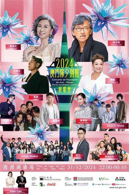 “2024澳門除夕倒數演唱會”將於12月31日晚上10時至翌日零時10分在西灣湖廣場舉行。演唱會邀請香港著名歌手林子祥、葉蒨文作壓軸演出嘉賓,為觀眾獻上激勵人心的經典歌曲,強大本地歌手及樂隊陣容包括:肥媽(Maria Cordero)、古淖文、陳慧敏、龍世傑、倪力、青原、Daze inWhite、Ocean Walker、英美超市、歐陽日華與DAX One Dance Complex等,演唱會由香港知名主持人王鎮泉及2019年澳門小姐冠軍梁洛郗聯袂擔任司儀,眾歌手將與觀眾一同倒數,迎接新一年來臨。