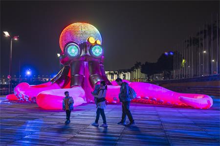 ․“蟹小寶”:巨大的粉色氣膜螃蟹雕塑裝置以誇張且有趣的形式展現,將海洋世界和藝術緊密結合,使成為澳門城市風景線的一部分。