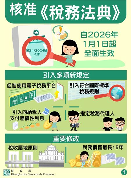 核准《稅務法典》自2026年1月1日起全面生效。相關過渡規定,包括統一納稅人的稅務住所,自2026年1月1日起計一年內,納稅人應向財政局告知或變更其獨一稅務住所。