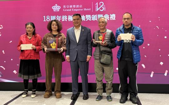 “英皇娛樂酒店18周年 終極大抽獎頒獎典禮”今(8)日下午在酒店舉行,抽獎遊戲於2024年12月底圓滿完成,由英皇娛樂酒店總經理達振洪在水晶殿宴會廳頒發獎品給四位得獎幸運兒。