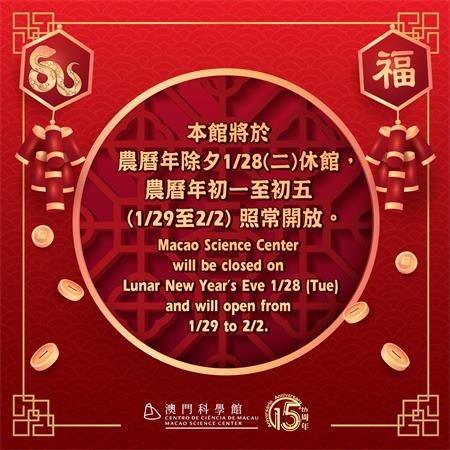 澳門科學館開放時間為星期一至日上午10時至下午6時,逢星期四及農曆年除夕休館,公眾假期照常開放。如欲了解更多活動及資訊,請瀏覽該館網站(www.msc.org.mo)及社交媒體的最新公佈。