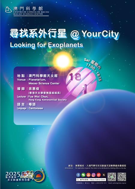 天文館將於1月18日下午5時舉行“點亮星辰—尋找系外行星@YourCity”。香港天文學會掩星組組長余惠俊會親臨現場與觀眾分享人類尋找系外行星的故事。農曆大年初一至初七(1月29日至2月4日)期間每日上午11時起,天文館更會加開球幕節目場次,歡迎公衆欣賞最新球幕節目《築夢天宮》,認識國家航天科技發展成果及航天員在空間站豐富多彩的生活。