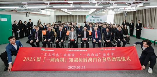 【本報訊】“一國兩制”知識檯曆編輯委員會、澳門青年發展服務中心及澳門學人發展協會等聯合主辦,“掌上明珠映輝煌一國兩制譜華章——2025版‘一國兩制’知識檯曆澳門首發暨贈閱儀式” 今(11)日在澳門青年發展服務中心舉行。主辦方冀藉活動進一步宣傳和推廣“一國兩制”,吸引更多澳門青年關注和支持“一國兩制”事業,發展壯大愛國愛澳力量,為推動澳門社會的繁榮穩定和長遠發展注入新的活力和動力。