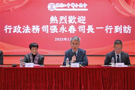 【本報訊】行政法務司司長張永春13日到訪澳門工會聯合總會並舉行座談,聽取該會就行政法務範疇本年度施政工作提出的意見和建議。