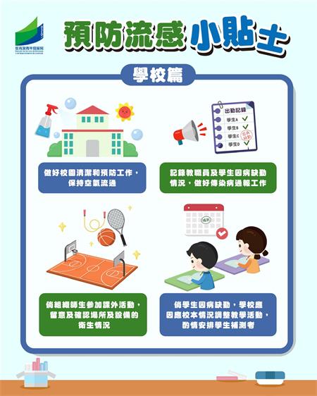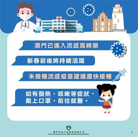 學校方面,隨著流感季節及春節假期將至,教青局將於明(15)日與全澳學校舉行會議,提醒學校做好校園清潔和預防工作,保持校園環境衛生清潔及空氣流通,加強健康教育。此外,學校應持續了解春節假期前後學生的身體情況。家長亦須時刻留意子女的身體狀況,尤其新春假期計劃外遊時,須注意提高衛生意識,如有不適應盡快就診及留在家中休息,及時通知學校子女的情況。
