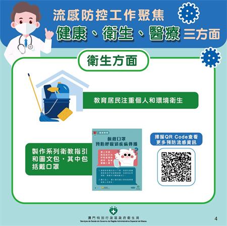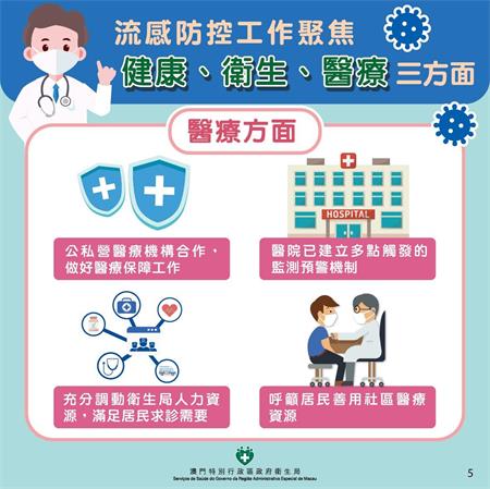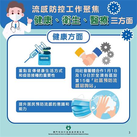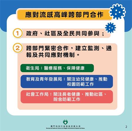 衛生局、教育及青年發展局、社會工作局將展開一系列跨部門防控工作,將從健康、衛生和醫療三個方面著手。在健康方面,衛生局將於本周末(1月18及19日)與社會團體和醫療機構合作,在全澳各區設置15個社區預防流感諮詢站,加強健康教育及推動疫苗接種的工作;在衛生方面,已製作了一系列教材、圖文包 ,並通過網絡(傳染病資訊網頁https://www.ssm.gov.mo/portal/csr/ch/main.aspx)展開宣傳教育工作,宣傳維持個人與環境衛生的重要性;在醫療方面,仁伯爵綜合醫院已建立多點觸發的監測預警機制,並充分調配人力資源。目前急診部門維持成人平均等候時間約1小時,高峰期約2小時,呼籲居民善用社區醫療資源,包括衛生中心、社區門診及私營診所等。此外,近期亦會與全澳醫療機構及醫療業界召開座談會,共同商討如何應對因流感導致的呼吸道傳染病醫療需求上升的情況。
