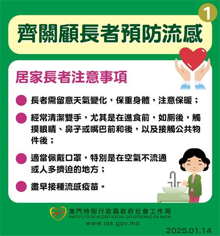 此外,社會工作局呼籲長者,尤其屬獨居或兩老家庭的長者留意天氣變化,保重身體,注意保暖,在人多擠迫的地方應佩戴口罩。倘有不適,應及早求醫,並在需要時向家人、親友及/或社會服務設施等尋求協助。社會工作局同時呼籲長者的家人、親友、鄰舍和物業管理人員等主動關心及慰問身邊長者。