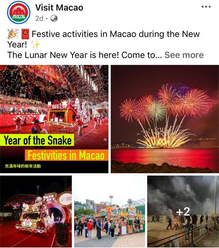 旅遊局積極鋪開線上線下宣傳工作,向旅客推廣澳門旅遊及農曆新年節慶活動,包括在社交平台發帖宣傳及邀請旅遊網絡達人在其頻道直播及宣傳,以及投放電視廣告、巴士廣告和戶外廣告等,又繼續在旅遊局月刊《旅遊快訊》宣傳澳門當月盛事活動。