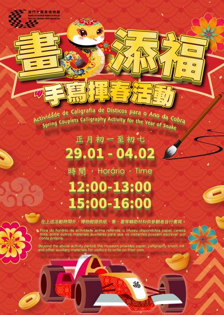 澳門大賽車博物館“畫蛇添福”手寫揮春活動將於大年初一至年初七(1月29日至2月4日)期間,每日中午12時至下午1時及下午3時至4時在澳門大賽車博物館地庫層舉行,歡迎居民和旅客參與,歡度佳節。活動現場有專人為參觀者書寫及送出“揮春”和“春/福貼”,數量有限,先到先得。