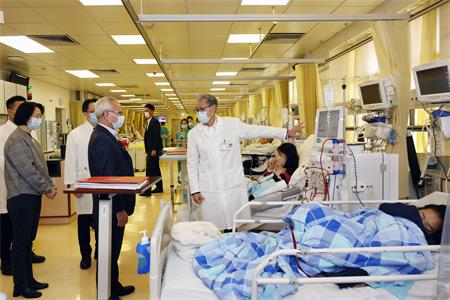 行政長官岑浩輝在醫院血液透析室與醫護人員交談,感謝他們堅守崗位