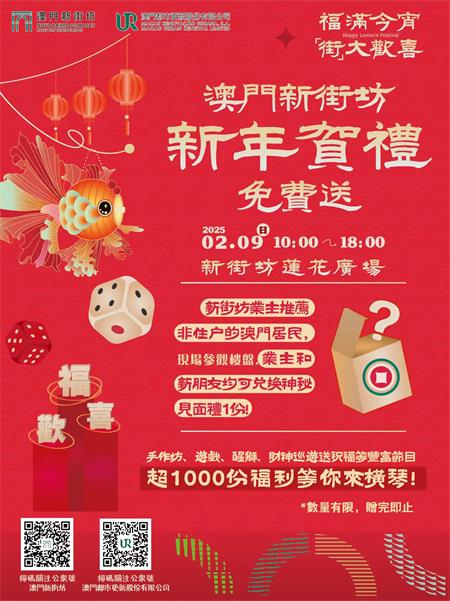 為歡迎更多市民同慶佳節,共度新街坊愉快時光,只要是新街坊業主攜同非住戶的澳門居民參加活動,均享神秘見面禮乙份,以答謝市民的支持。現場設有多個年味遊戲攤位,齊來贏取各式各樣“好意頭”獎品,獎品數量有限,送完即止。