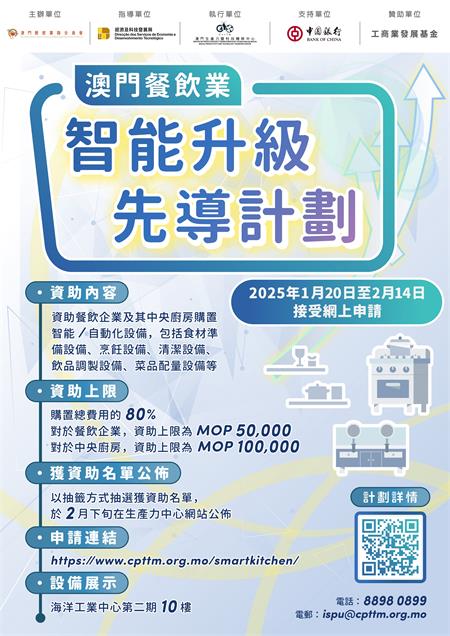本次計劃由澳門餐飲業聯合商會主辦、經濟及科技發展局指導、澳門生產力暨科技轉移中心負責執行。該計劃以資助形式,支持本澳餐飲企業及其附屬的中央廚房進行設備升級。申請對象可根據自身需求提出申請購置智能或自動化設備,資助最高可達相關費用的八成。對於餐飲企業,資助上限為50,000澳門元;對於中央廚房,資助上限為100,000澳門元。