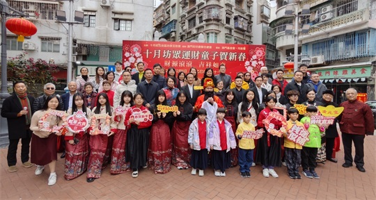 【本報訊】十月初五街區坊眾互助會主辦,澳門街坊會聯合總會協辦,澳門基金會、市政署贊助的“十月坊眾運財童子賀新春”今(8)日下午假康公廟前地休憩區舉行,隨後聯同“財神爺”“財子”“財女”向社區內商戶和街坊拜年,互致新春祝福。