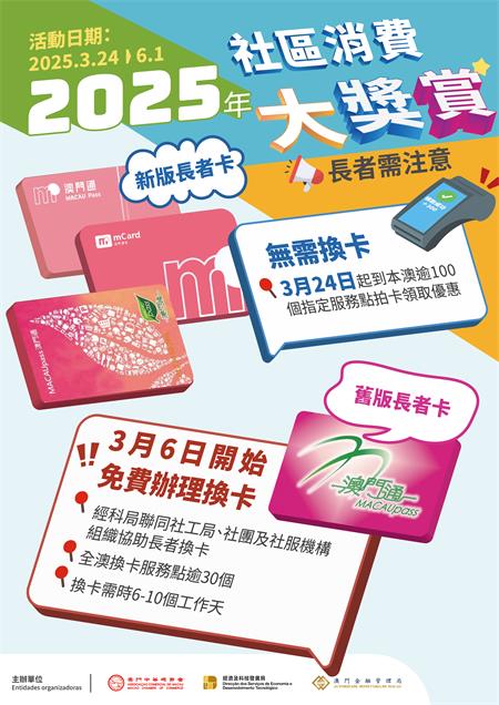 為便利長者換領新卡,經科局將聯同社工局協調社服機構及社團,自36日起,為需要更換新卡的長者辦理換卡手續,全澳服務地點逾30個,費用全免,換卡需時610個工作天。換卡及服務點詳情將於稍後公佈。