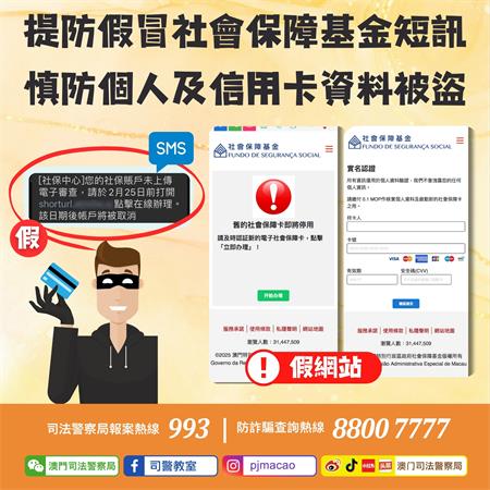 【本報訊】司法警察局今日接獲社會保障基金檢舉,指有人冒充社會保障基金發出釣魚短訊,內容聲稱“社保帳戶未上傳電子審查”,要求市民點擊短訊內附帶的連結,否則將註銷帳戶。