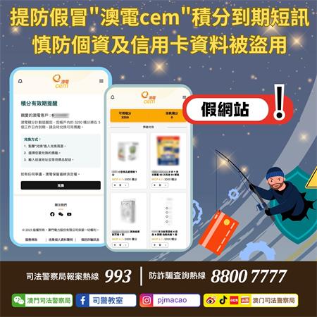 警情通告:提防假冒“澳電cem”積分到期短訊 慎防個資及信用卡資料被盜用