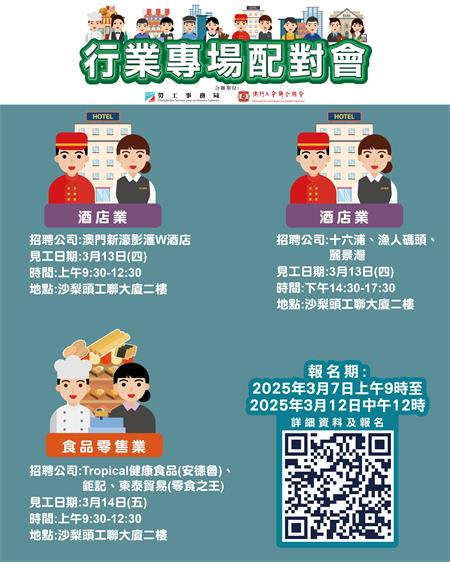 313日全日酒店業配對會及314日上午食品零售業配對會均在澳門工會聯合總會二樓(沙梨頭海邊街2-6號工聯大廈)舉行。報名日期為37日上午9時至312日中午12時。