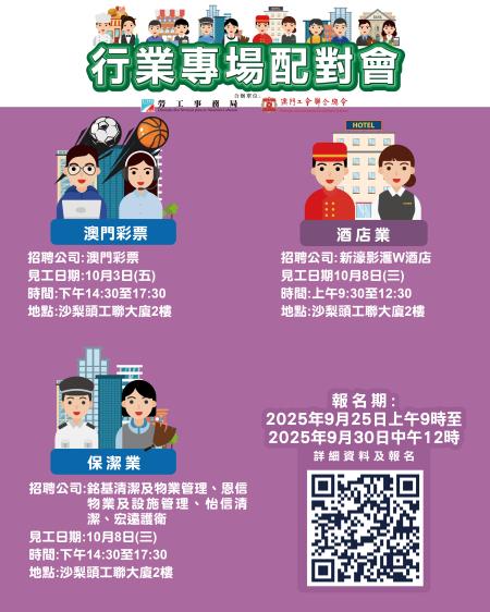 10月3日下午澳門彩票有限公司專場配對會、10月8日上午酒店業專場配對會及同日下午保潔業專場配對會均在澳門工會聯合總會二樓(沙梨頭海邊街2-6號工聯大廈)舉行。報名日期由即日起至9月30日中午12時。