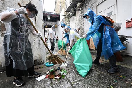 【本報訊】超強颱風“樺加沙”襲澳前,在行政長官指示下,行政法務司協調行政長官直屬部門、各司範疇屬下部門,連同立法會、法院、檢察院、廉政公署及審計署等逾四十個部門,動員公務人員組成公共部門風後支援隊。116隊支援隊逾1,100名公務人員今(25)日早上走進澳路氹各個社區的大街小巷、公園、休憩區,參與善後清理工作,聯同保安部隊及保安部門、13個社區民防聯絡機制成員、民防志願者,以及社團志願者等,同心協力,清理社區環境,協助居民商戶儘快恢復正常生活。
