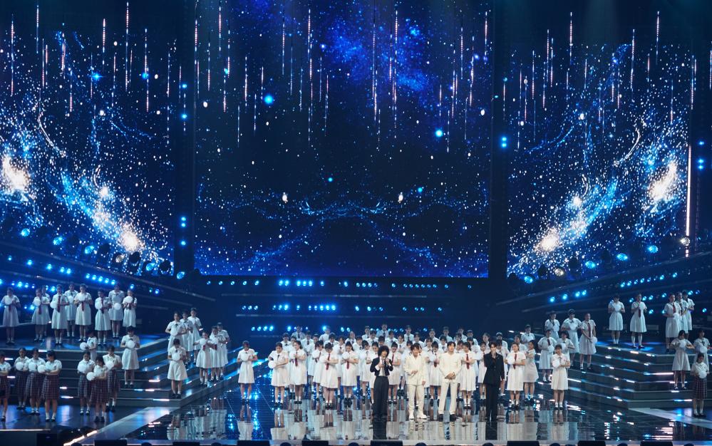 9月28日,“灣區升明月”2025大灣區電影音樂晚會在中國澳門銀河綜藝館舉行。圖為合唱歌曲《夜空中最亮的星》。 中新社記者 鄭嘉偉 攝