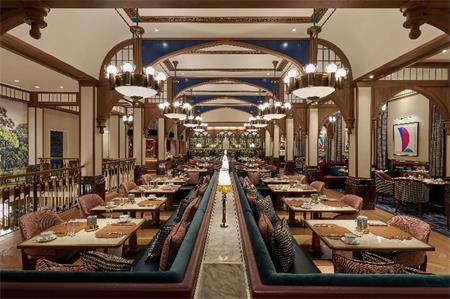 場地橫跨三層,各區域功能與美學分明:作為核心的亨利私廚設有開放式廚房貫穿整個空間,提供極為豐富的自助早餐和晚餐,讓賓客宛如置身宮廷盛宴;Tudor Lounge採用大理石壁爐和天鵝絨,營造奢華靜謐的小天地;Jester’s Corner以大型圖案搭配宮廷小丑服裝為靈感的條紋,活現玩味十足的甜品區;而隱蔽的Bard’s Bar則透過皮革壓花吧台、幾何紋樣地氈和大型落地燈等設計元素,締造私密調酒空間。