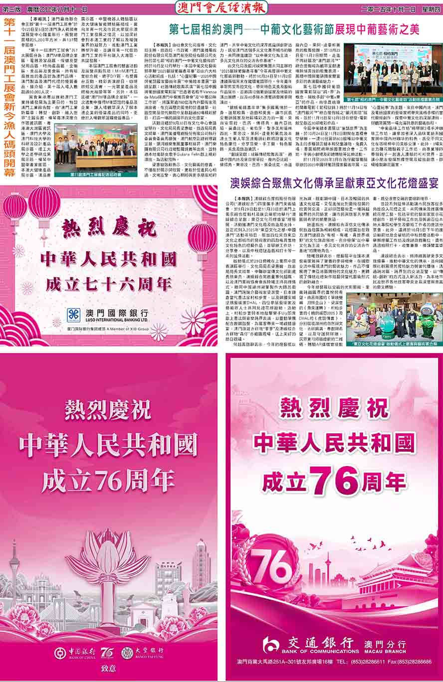 【本報訊】澳娛綜合度假股份有限公司(“澳娛綜合”)四度攜手澳門美術協會,於9月29日起至11月23日於澳門上葡京綜合度假村及康公廟前地舉行“澳娛綜合呈獻:東亞文化花燈盛宴”燈藝展,活動獲澳門文化局及旅遊局支持,並正式列入2025年“東亞文化之都・中國澳門”活動年項目,展出四位來自東亞文化之都城市的藝術家的四款極具當地文化特色的燈藝作品;並舉辦工作坊、分享會,以及中秋燈謎遊戲和打卡等一系列延伸活動。