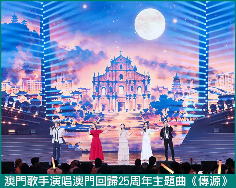 晚會上,澳門指揮家許健華執棒澳門青年交響樂團,以精湛演奏拉開序幕。隨後,澳門歌手歐陽日華、蘇耀光、梁嘉寶、殷巧兒、龍紫嵐共同獻唱慶祝澳門回歸祖國25周年的主題曲《傳源》,獲現場觀眾熱烈回應,蓮花衛視主持人劉乃奇擔綱晚會主持,歌手江信熹亦與其他地區歌手同台獻唱,以歌聲傳遞澳門與大灣區共同的情感與夢想。此外,澳門少兒藝術團、澳門培正中學舞蹈團、濠江中學舞蹈團、坊眾學校舞蹈團、澳門舞蹈家協會及尚澳國際標準舞蹈協會也聯手呈現多支舞蹈作品,以優美的舞姿與富有創意的編排,展現了澳門年輕一代的藝術才華與活力。