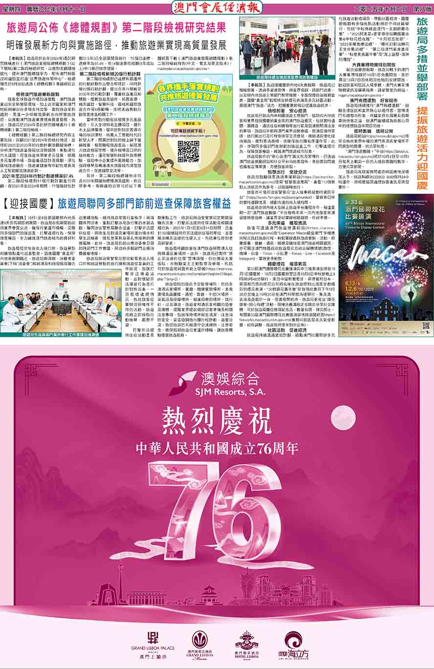 【本報訊】10月1至8日是國慶節內地長達8天長假期即將展開,旅遊局在假期開始前與業界會面交流,確保行業運作順暢,又聯同多個部門加強巡查,打擊違規行為,保障旅客權益,全力維護澳門旅遊城市的良好形象。