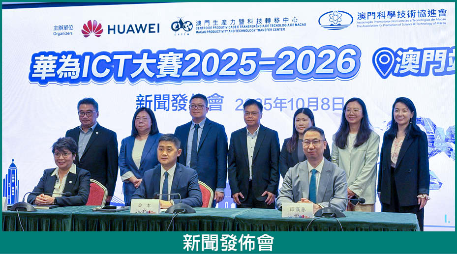 “華為ICT大賽2025-2026澳門站”新聞發佈會於8日11時於澳門科學館會議中心會議室舉行。華為澳門分公司總經理金本、澳門生產力暨科技轉移中心理事長關治平、澳門科學技術協進會理事長邵漢彬等一眾嘉賓及師生出席新聞發佈會。