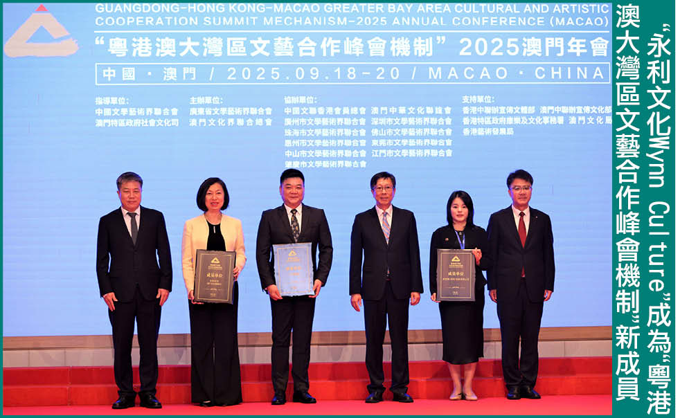 【本報訊】“粵港澳大灣區文藝合作峰會機制”2025澳門年會於9月19及20日於澳門舉行。永利旗下文化品牌“永利文化Wynn Culture”於年會上獲選加入該機制的新成員,並獲頒發牌匾,標誌著“永利文化Wynn Culture”在推動文化藝術發展方面的努力獲得了廣泛認可,並將進一步助力粵港澳大灣區文化藝術的交流、合作與創新。