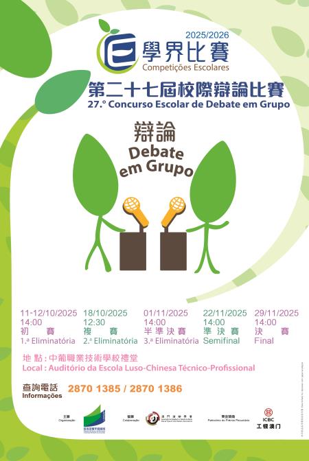 【本報訊】為培養學生的分析和邏輯思維能力,訓練其語言表達能力和技巧,由教育及青年發展局主辦、澳門演辯學會協辦、中國工商銀行(澳門)股份有限公司獎金贊助的2025/2026學年“第二十七屆校際辯論比賽”將於2025年10月至11月期間假中葡職業技術學校禮堂舉行。