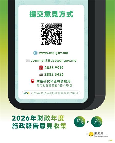 【本報訊】為期一個月的《2026年財政年度施政報告》意見收集工作將於1017日結束,特區政府呼籲社會各界把握機會積極提出意見和建議。