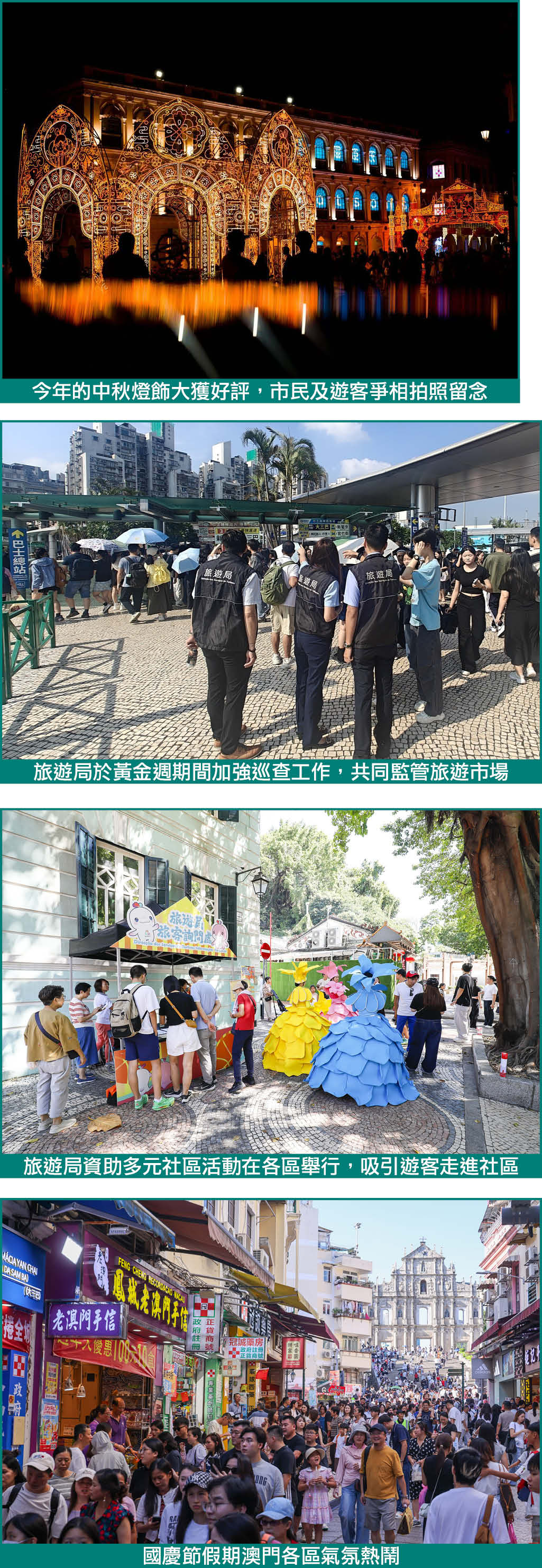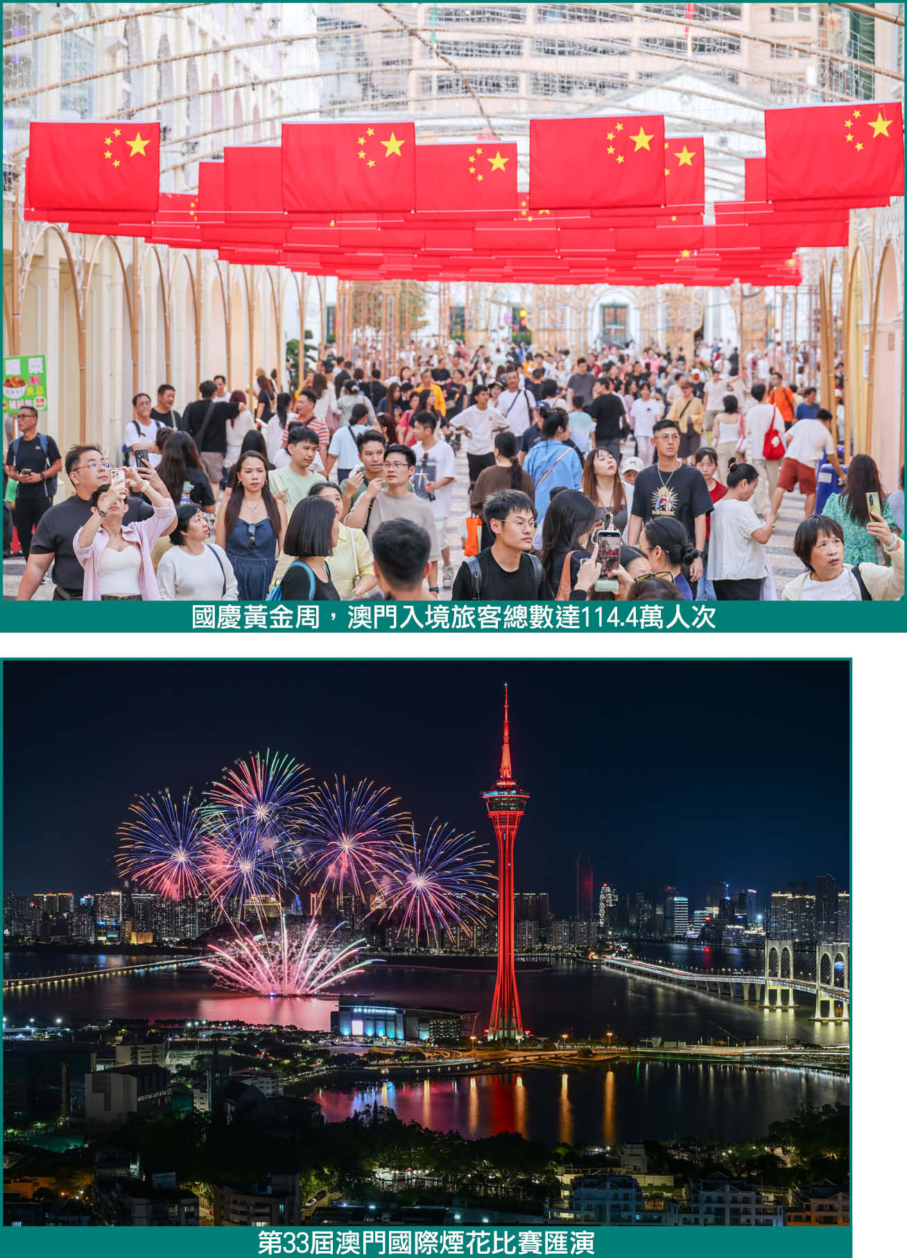 今年內地“十一”國慶黃金周與中秋節“雙節”重疊,為期8日的長假期已於10月8日圓滿結束。即使期間受颱風影響,整體旅遊秩序良好,市面人流暢旺,飲食、酒店、零售等不同行業均反映市道理想。從“中國紅”到“中秋月”,這個雙節假期澳門特區政府聯同社會各界持續推出了豐富的文旅“大餐”,各項節慶活動精彩紛呈,著力於“強化特色”和“提升體驗”。據治安警察局公布的數據,一連八日有超過114.4萬人次旅客入境,每日平均14.3萬人次,酒店入住率更是逾九成,反映澳門消費市場熱氣騰騰,假日經濟活力持續釋放。
