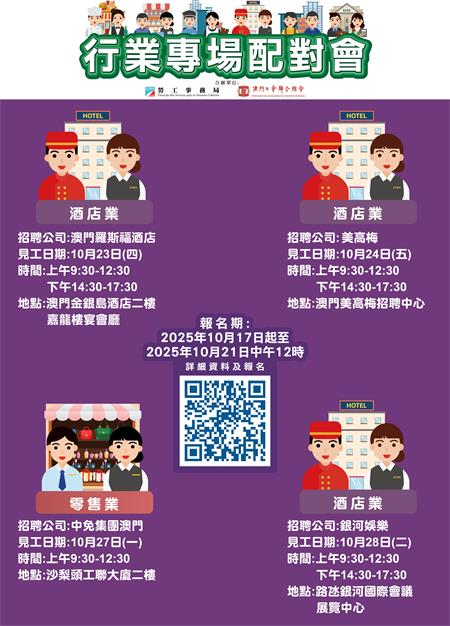 10月23日“澳門羅斯福酒店有限公司”專場配對會在澳門金銀島酒店二樓嘉龍樓宴會廳舉行;10月24日“美高梅金殿超濠股份有限公司”專場配對會在澳門美高梅招聘中心舉行;10月27日“中免集團澳門一人有限公司”專場配對會在澳門工會聯合總會二樓(沙梨頭海邊街2-6號工聯大廈二樓)舉行;10月28日“新銀河娛樂2006有限公司”專場配對會在澳門銀河國際會議中心。報名期10月17日起至10月21日中午12時。