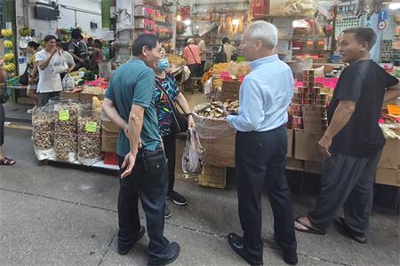在政府總部與眾同樂後,岑浩輝還自個走訪義字街一帶買菜,與商戶和市民交談,支持本地消費。