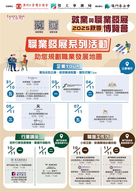 【本報訊】為持續協助澳門居民拓展職業發展、助力緊握發展機遇,促進人才與企業對接;澳門工會聯合總會與勞工事務局將於2025年11月10日至11日一連兩日假澳門旅遊塔會展娛樂中心四樓聯合舉辦大型招聘會,2025秋季“就業與職業發展博覽會”以“多元就業渠道、行業職涯交流、現場面試招聘及職涯輔助服務”四大方向為主軸,特設“職業發展系列活動”,其中聯合部分招聘企業推出企業參觀+求職技巧的活動(企業Tour),讓參與者親身體驗企業環境與文化,從中更能透過過程獲得實用求職技巧,助力增強居民就業能力與職業發展。