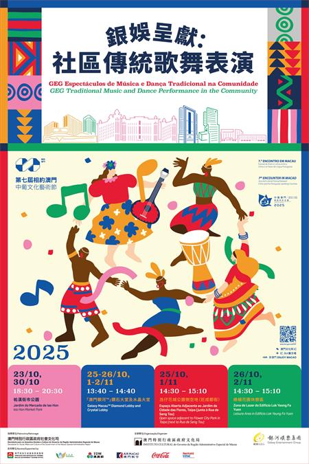 “銀娛呈獻:社區傳統歌舞表演”誠邀市民及旅客親臨現場,共同感受中葡文化交融的藝術魅力。演出詳情及場次安排,可瀏覽“相約澳門——中葡文化藝術節”專頁(www.icm.gov.mo/FCP)、Facebook專頁“IC Art藝文棧”或微信公眾號“澳門文化局IC”。