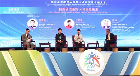 大會亦邀請三位澳門重點產業的領軍人物作主題演講,包括:普強(國際)科技有限公司創始人兼行政總裁何國濤;廣東躍昉科技有限公司創始人、首席執行官和首席技術官江朝暉;以及澳門通集團控股有限公司董事會主席兼總經理、螞蟻銀行(澳門)股份有限公司董事長孫豪。三位嘉賓主要講述澳門作為國家高水平對外開放的重要橋頭堡,企業在澳門、橫琴粵澳深度合作區、粵港澳大灣區乃至國際市場的發展潛力,並分享人才在澳門及粵港澳大灣區的發展機遇,現場氣氛熱烈。