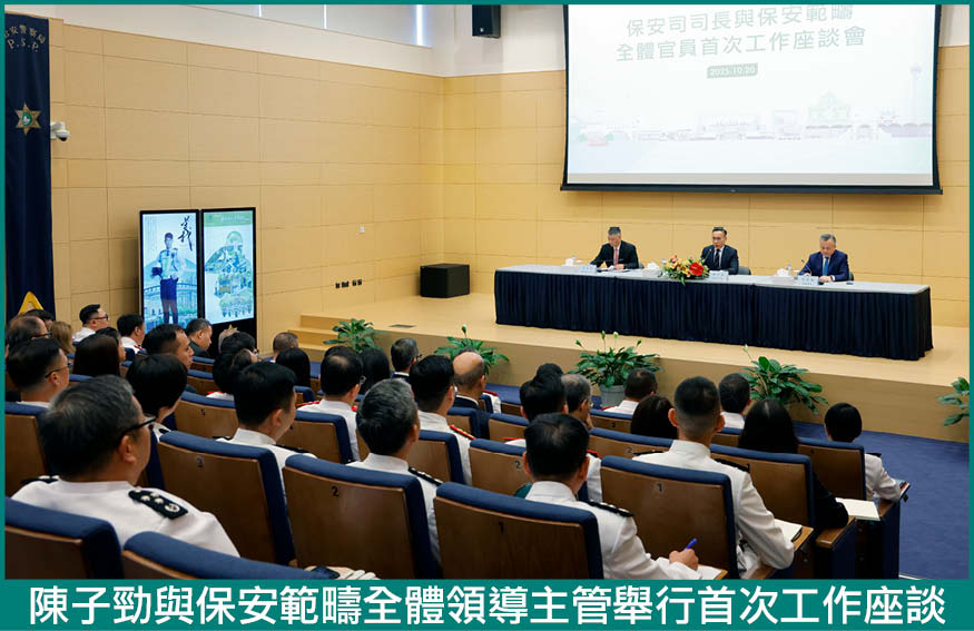 【本報訊】澳門保安司司長陳子勁10月20日上午在治安警察局總部大樓主持召開保安範疇的工作座談,參與座談包括警察總局局長梁文昌及海關關長何浩瀚,以及保安範疇全體領導主管。會上,陳子勁司長總結過去的工作成果、傳達施政理念及對未來工作方向作出部署。